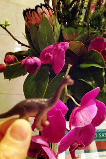 There are new flowers in the lobby and Dino wanted to eat sniff them.